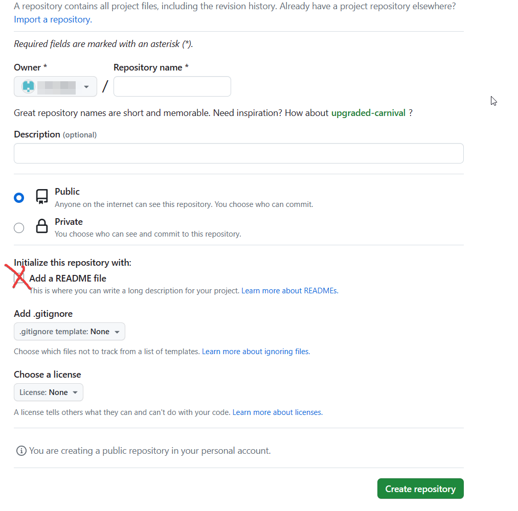 因为勾选之后会导致 github 会进行一次默认的提交,生成一个 默认的 branch (以前是master,现在是 main),导致和你本地的 branch 名不一致,导致无法正常提交。(当然不是没办法,但这不是本文的讨论范畴)