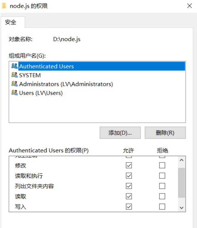 - 选择 安全 ,点击 编辑 ,将 Authenticated Users 和 User 的权限修改为