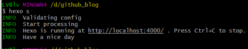 在刚刚的git bash 界面中输入hexo server 或者 hexo s,即可启动hexo本地服务器。