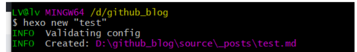 停止服务器,继续在git bash 界面中输入 hexo new "test" 创建一个名为 test 的 .md 文件,在当前目录的 source/_posts 目录下