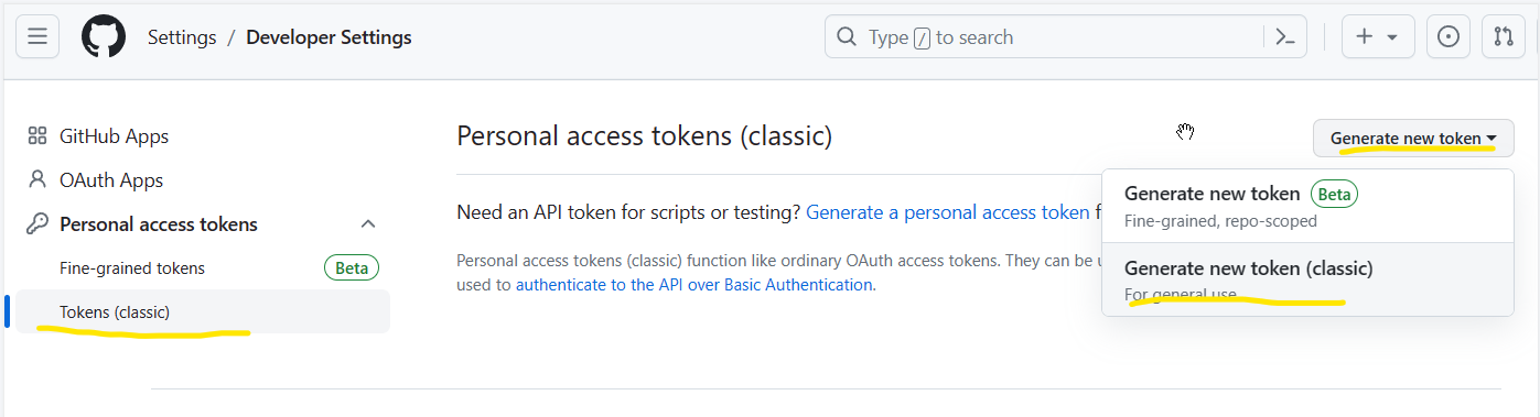 4.点击 Personal access tokens,然后选择 Tokens,点击右边的 Generate new token,选择 Generate new token classic。
