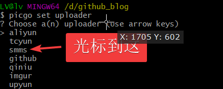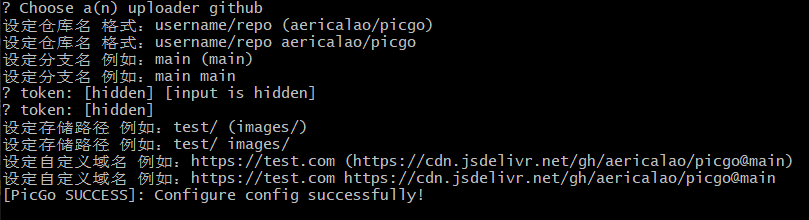 3.配置picgo的github,执行 picgo set uploader,使用小键盘的↑↓选择,Enter进行确认,配置的东西和上面picgo客户端一致,下面是我已经配置好的。