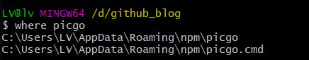 2.执行 where picgo 可以查看picgo的安装路径,看见 picgo 和 picgo.cmd,则说明安装成功