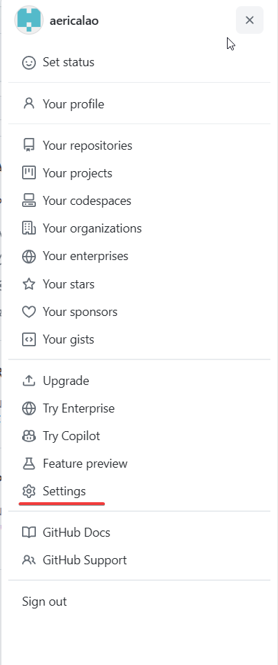 2.仓库创建完成以后,点击右侧自己的头像,选择 settings