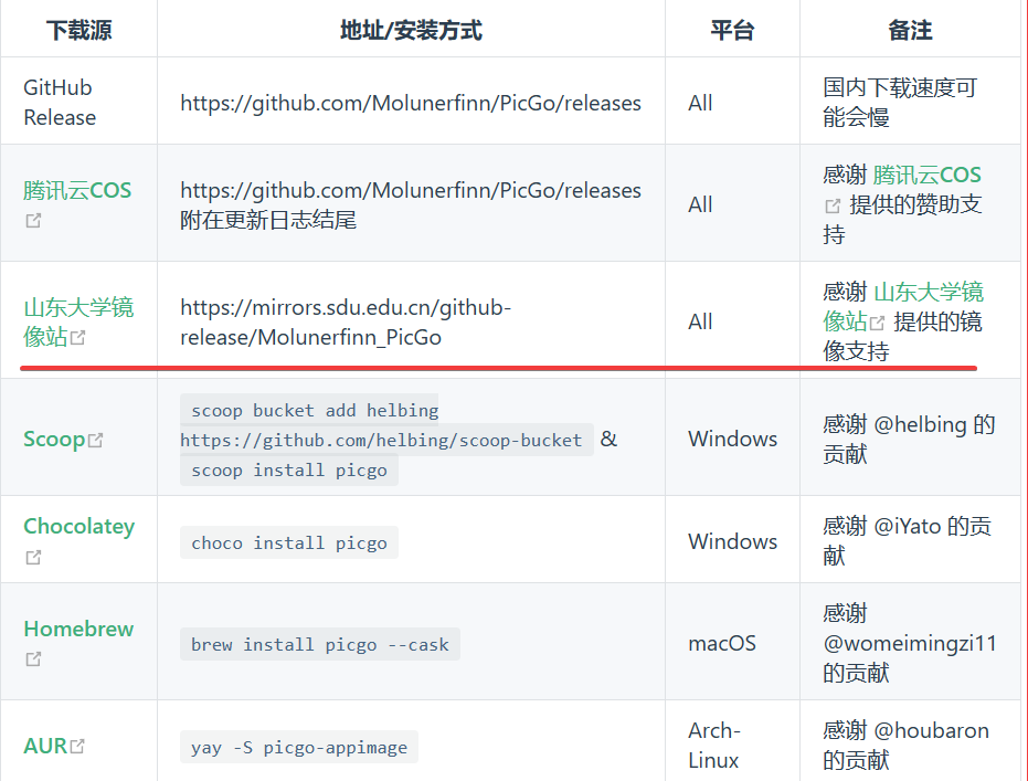 1.打开picgo官网,可以看见许多下载方式,这里使用的是山东大学镜像站
