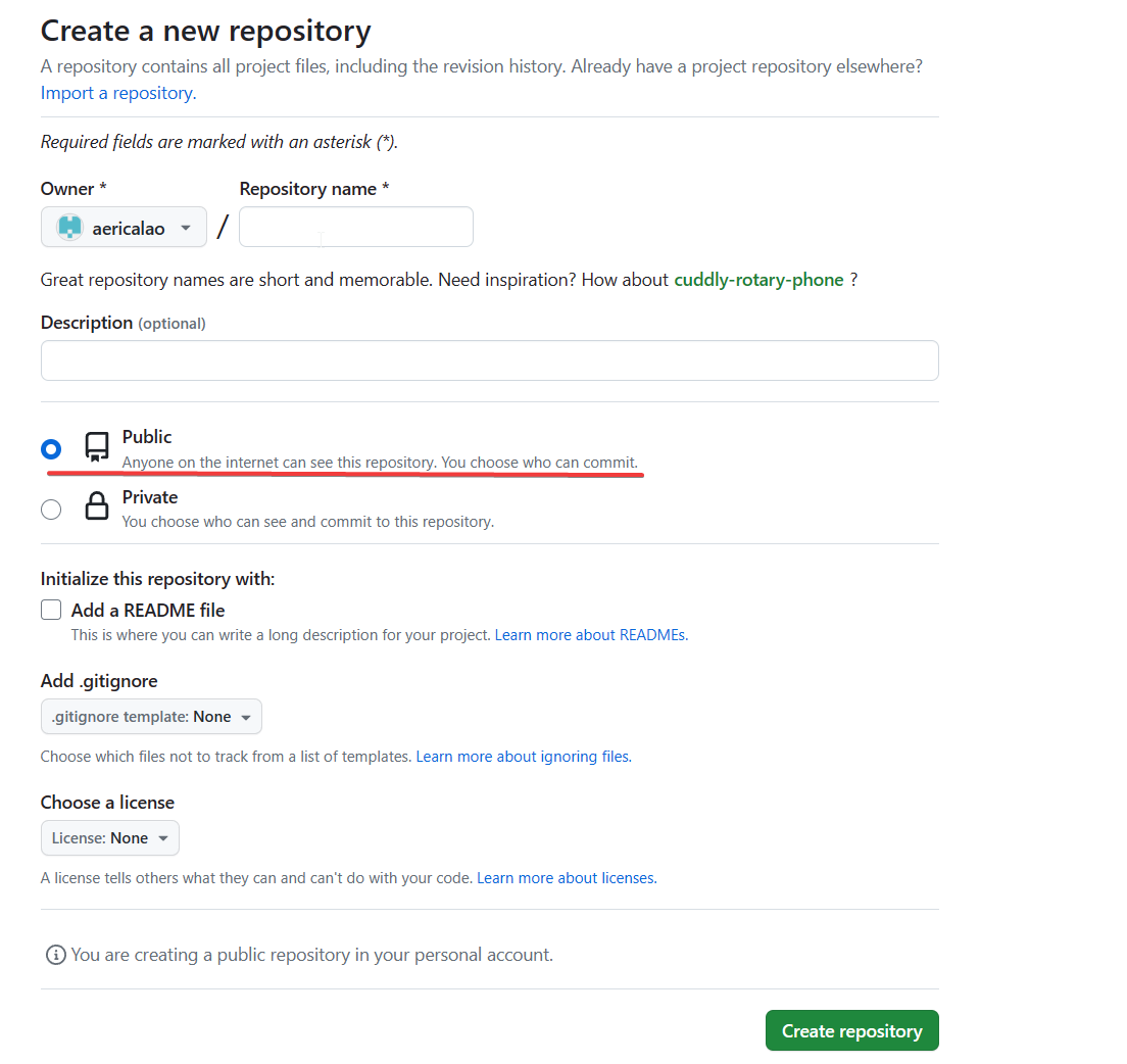 1.创建一个 github 仓库 ,repository name 自己订,但是下面的必须选Public(血泪教训,不然后面只能上传github,但是图片根本不显示)