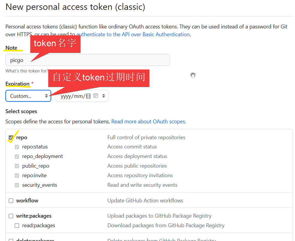5.自定义Note 和 Expiration,记得勾选 repo,然后划到最下面点击 Generate token即可