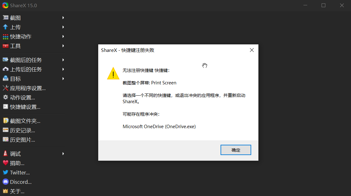 2.安装 shareX后,可能会出现,这是因为ShareX默认的截图快捷键和windows自带的截图快捷键发生了冲突,自行取消一个即可。